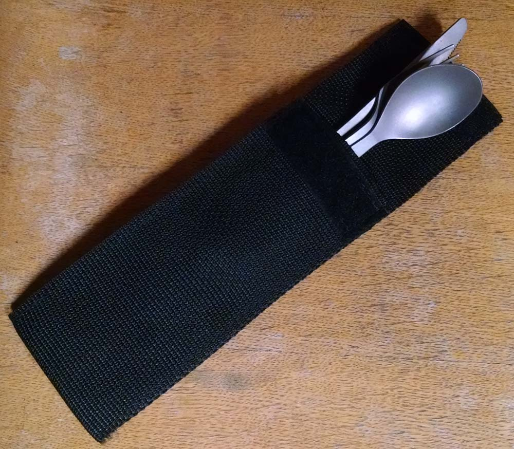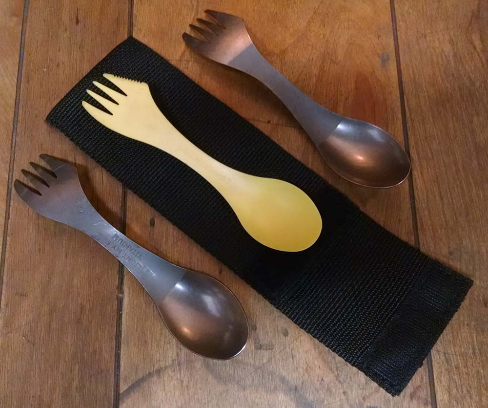 - Backpacking cutlery under 7″ long (knife, fork, & spoon, or 3 nested sporks)