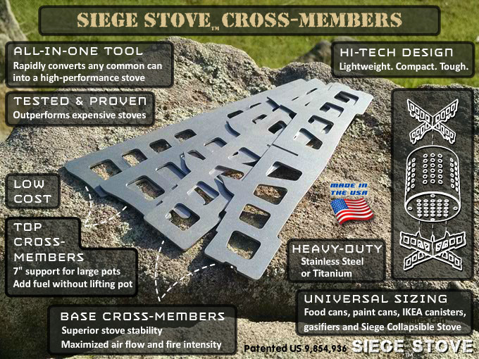 Set of 4 precision laser-cut SIEGE Cross-Members in 304 stainless steel. The essential all-in-one Survival Stove Creation Tool. Packs flat for ultra-compact portability.